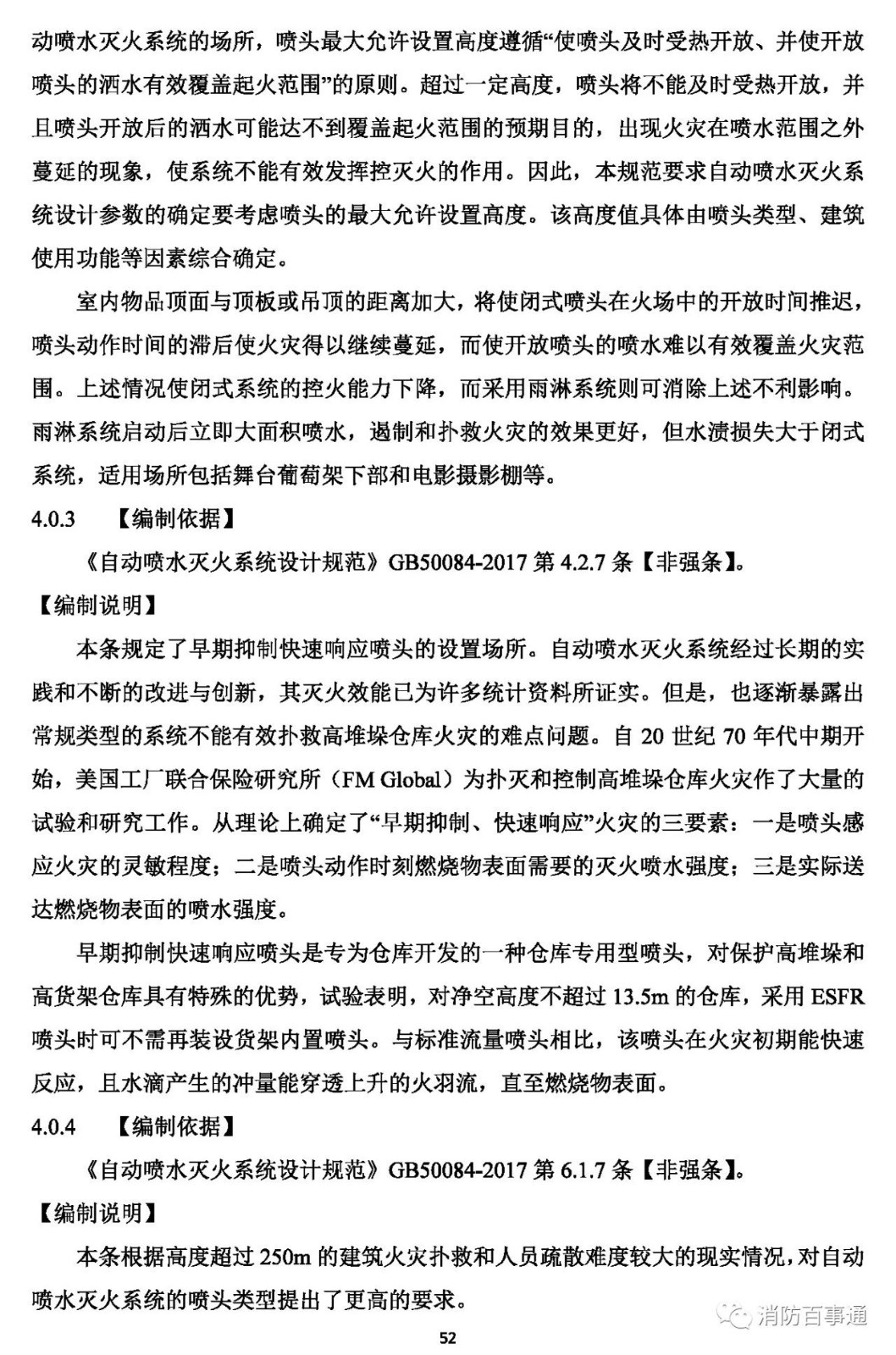 4.0.1 工業和民用建筑內的自動噴水滅火系統,其噴水強度、作用面積、噴頭工作壓力、噴頭間距等參數應與其火災危險等級、室內凈空高度等相適應。