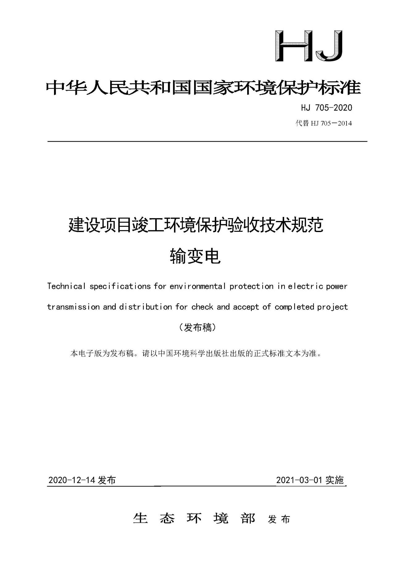 自上述標準實施之日起,《環境影響評價技術導則 輸變電工程》(HJ 24-2014)、《建設項目竣工環境保護驗收技術規范 輸變電工程》(HJ 705-2014)廢止。