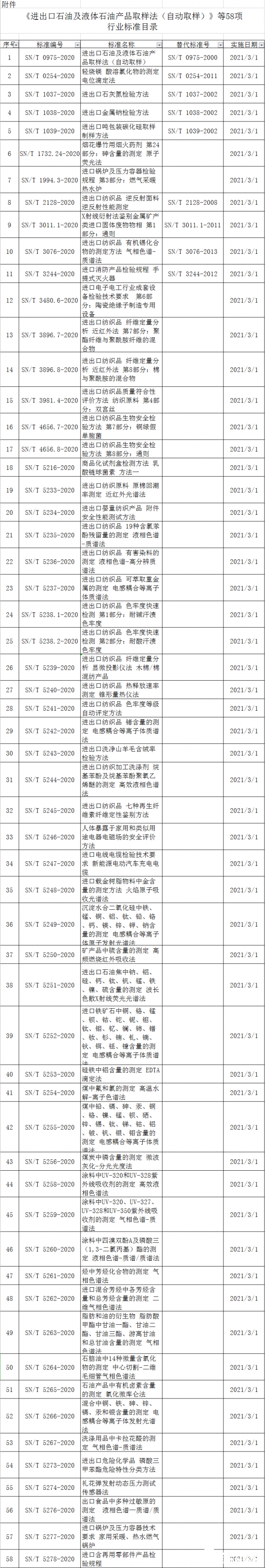 現發布《進出口石油及液體石油產品取樣法(自動取樣)》等58項行業標準(目錄見附件)。《進出口石油及液體石油產品取樣法(自動取樣)》(SN/T 0975—2000)等9項被代替標準自新標準實施之日起廢止。