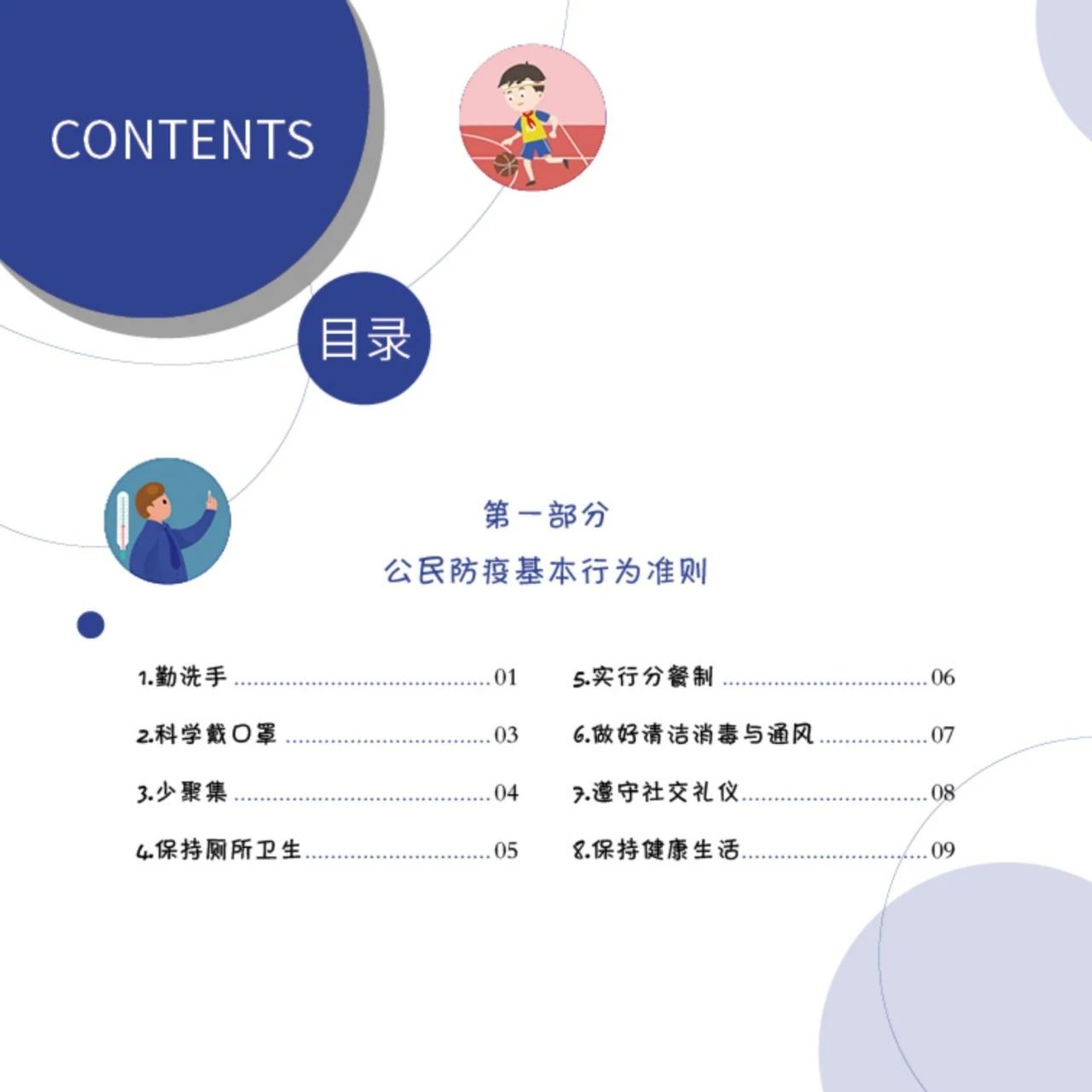 第一部分為公民防疫基本行為準則,包括勤洗手、戴口罩、少聚集、分餐制、社交禮儀以及廁所衛生、通風與消毒、健康生活等八方面;