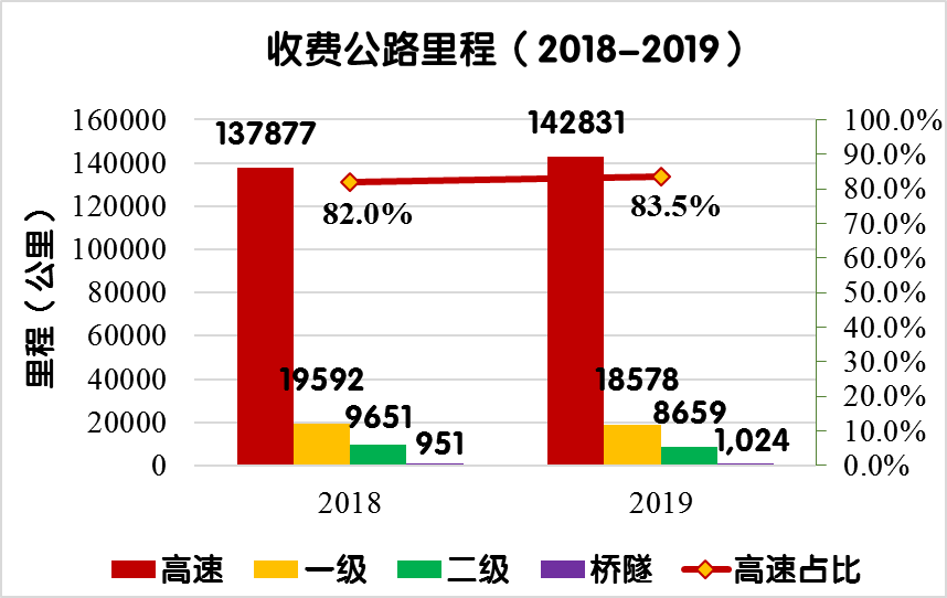 與上年末相比,全國收費公路總里程由168071公里增加到171093公里,凈增加3022公里,增長1.8%。其中,高速公路里程由137877公里增加到142831公里,凈增4954公里,增長3.6%;一級公路由19592公里減少到18578公里,凈減1014公里,下降5.2%;二級公路里程由9651公里減少到8659公里,凈減992公里,下降10.3%;獨立橋梁及隧道里程由951公里增加到1024公里,凈增73公里,增長7.7%。隨著高速公路里程不斷增長和普通收費公路逐步到期停止收費,全國收費公路結構進一步優化。