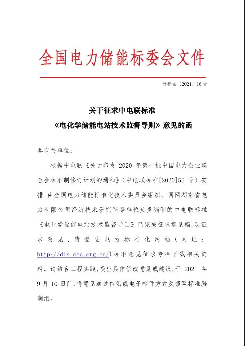 征求意見(jiàn):關(guān)于征求中電聯(lián)標(biāo)準(zhǔn)《電化學(xué)儲(chǔ)能電站技術(shù)監(jiān)督導(dǎo)則》意見(jiàn)的函