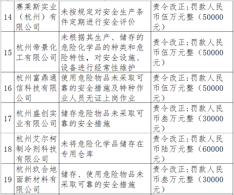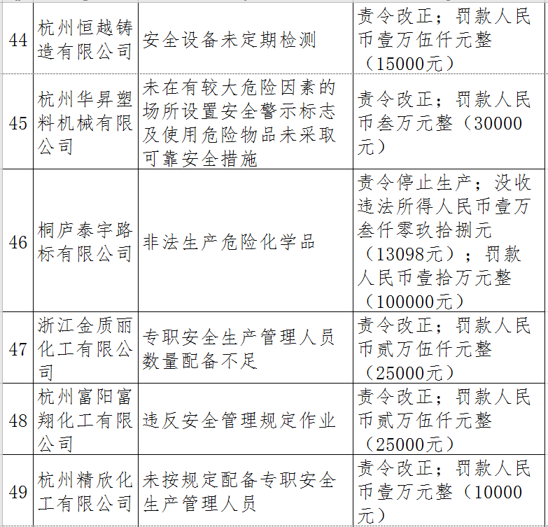 據了解,今年上半年,杭州市應急管理局一手抓駐企復工復產、一手抓安全生產,已完成年度執法計劃、專項檢查、聯合執法、信訪舉報核查等,并對檢查中發現的安全生產違法違規企業(個人)進行了處罰。現對52家被行政處罰的企業(個人)進行曝光,希望各企業引以為戒!