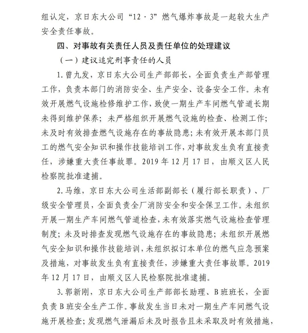 3.郭新剛,京日東大公司生產部部長助理、B 班班長,全面負責 B 班安全生產工作。事故發生當日未對一期生產車間燃氣設施開展檢查;發現燃氣泄漏后未及時報告且未采取及時有效措施,14對事故發生負有直接責任,涉嫌重大責任事故罪。2019 年 12 月 17 日,由順義區人民檢察院批準逮捕。