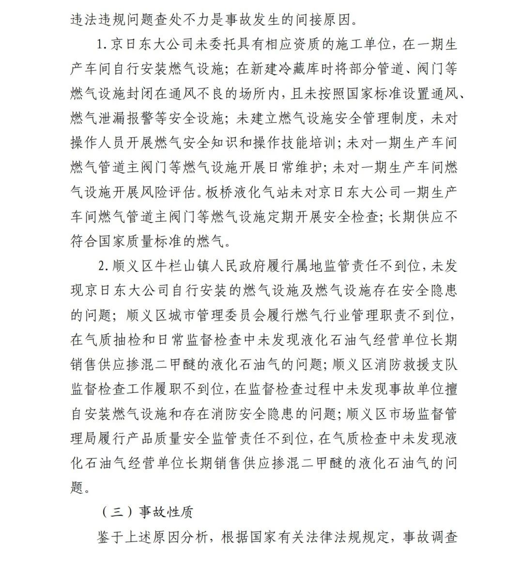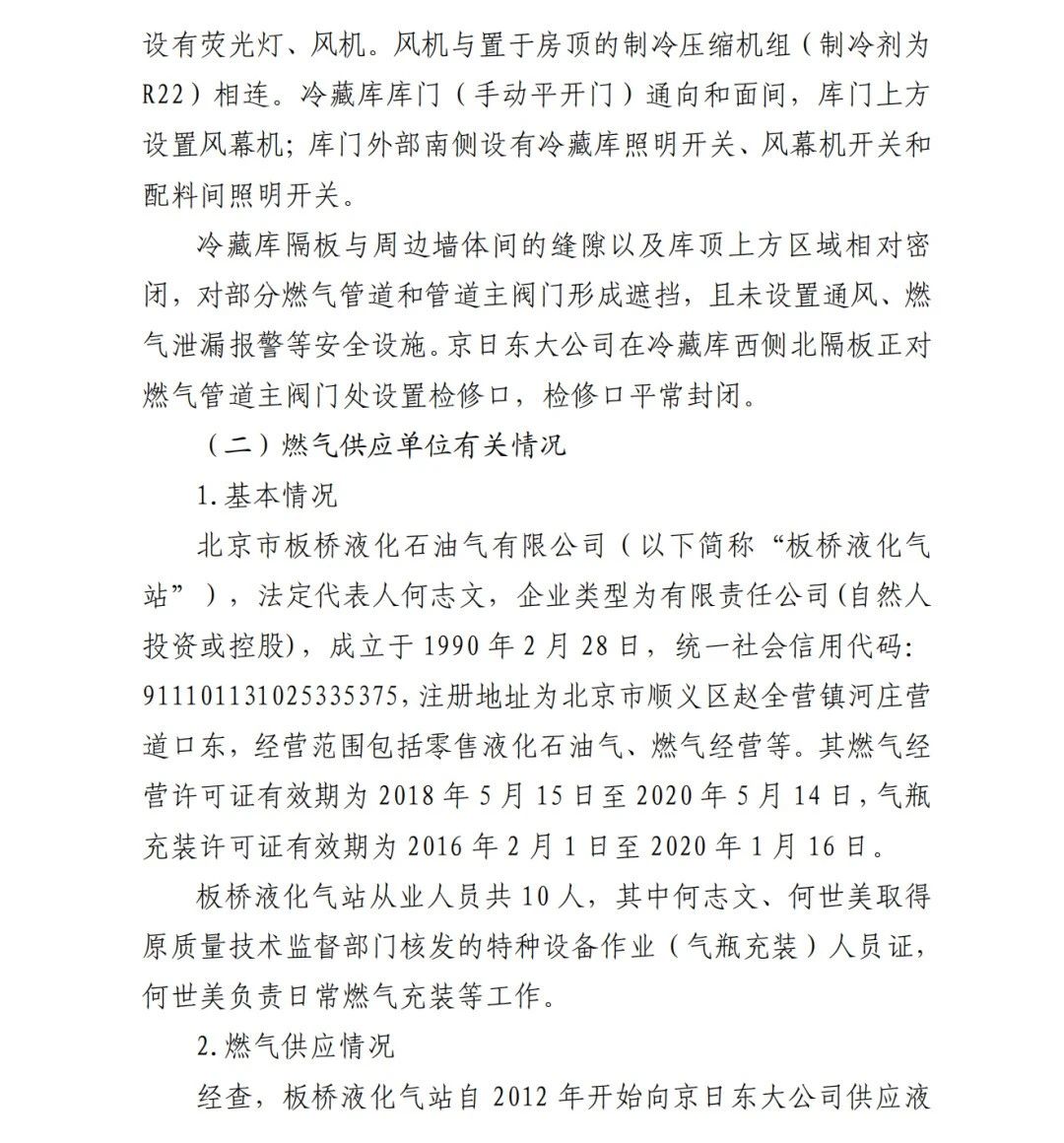 事故調查報告顯示:方勇忠2006年負責京日東大公司一期生產車間建設工作,期間未委托具有相應資質的施工單位,而組織本單位人員自行建設安裝燃氣設施,導致燃氣設施安全隱患長期存在。另外,方勇忠2018年負責一期生產車間內新建冷藏庫建設,將部分管道、閥門等燃氣設施封閉在通風不良的場所內,且未設置通風、燃氣泄漏報警等安全設施,因而對事故發生負有直接責任。