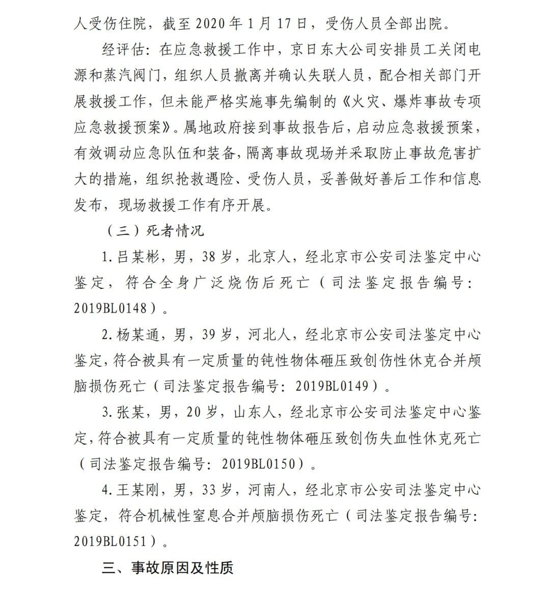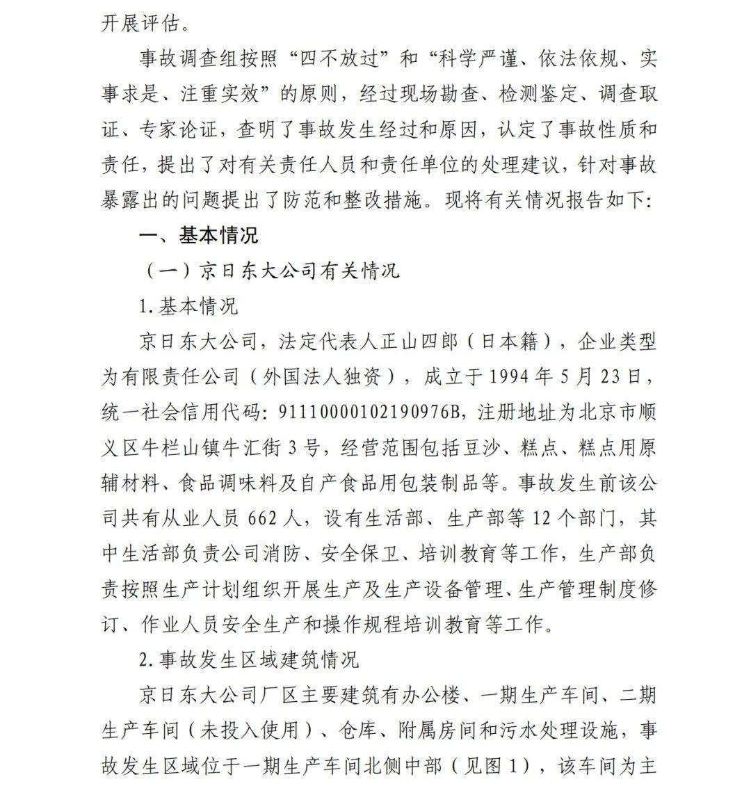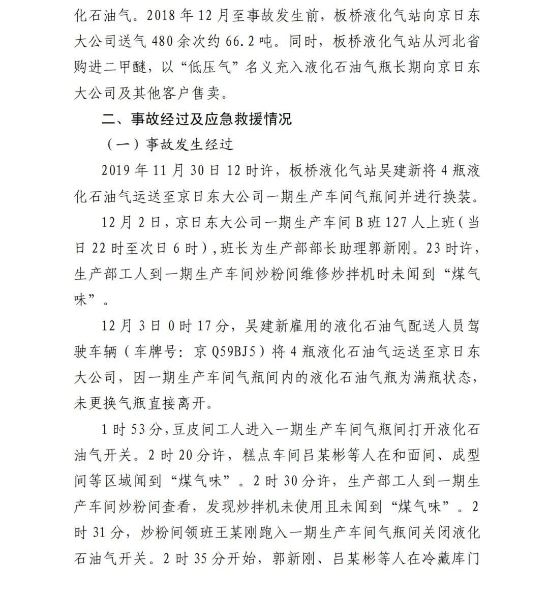 4.方勇忠,曾先后擔任京日東大公司生活部副部長兼設備部部長助理、設備部部長、生產部部長兼設備部部長、總經理助理(2019年4月辭職)。2006年負責京日東大公司一期生產車間建設工作,期間未委托具有相應資質的施工單位,組織本單位人員自行建設安裝燃氣設施,導致燃氣設施安全隱患長期存在;2018 年負責一期生產車間內新建冷藏庫建設,將部分管道、閥門等燃氣設施封閉在通風不良的場所內,且未設置通風、燃氣泄漏報警等安全設施,對事故發生負有直接責任,涉嫌重大責任事 故罪。2020 年 1 月 23 日被順義公安分局刑事拘留,2 月 6 日取 保候審,建議依法追究刑事責任。