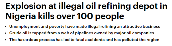 非法原油煉制產業有著致命后果,這些原油通常都是從大型石油業者們縱橫交錯的管線接取, 在簡陋儲槽煉制成油品. 程序復雜而危險, 已經造成了許多致命意外事故,。