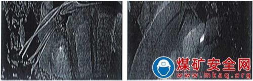 采煤機前滾筒在工作面中間巷巷口中部,外露部分有7處損壞截齒座和截齒;后滾筒在溜尾方向距中間巷10m處,后滾筒上纏繞有錨索(見圖4)。