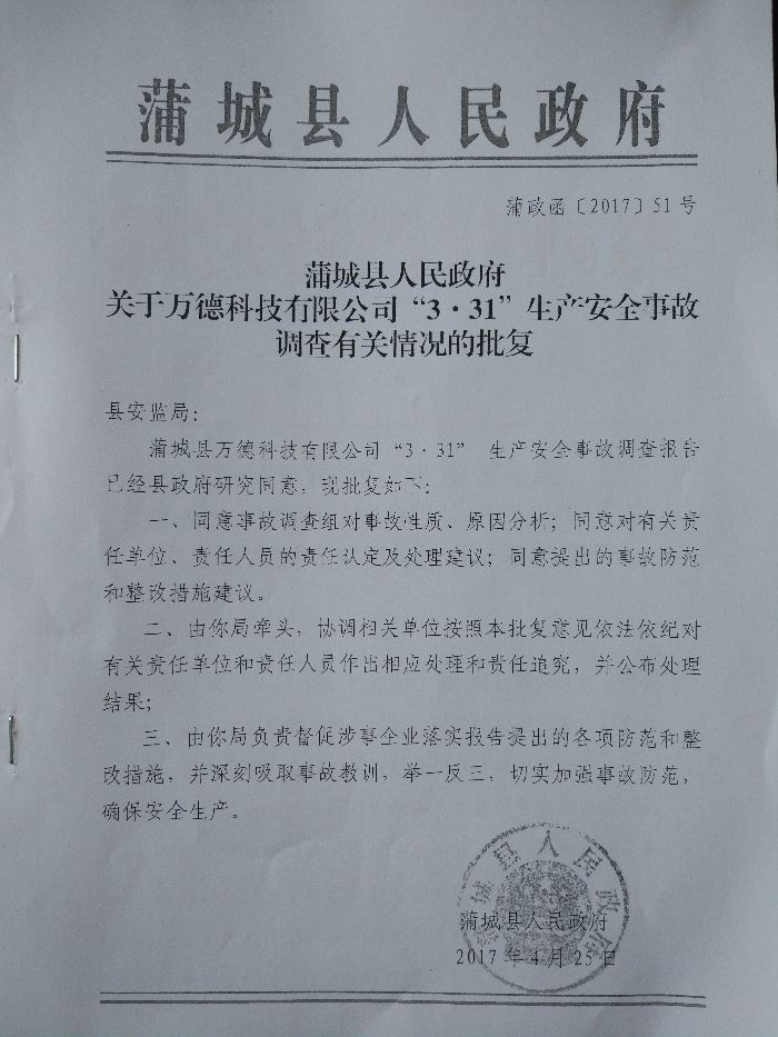 2、對本起事故主體責任單位蒲城萬德科技有限公司,依據《安全生產法》第一百零九條第一款,建議處以五十萬元的罰款。