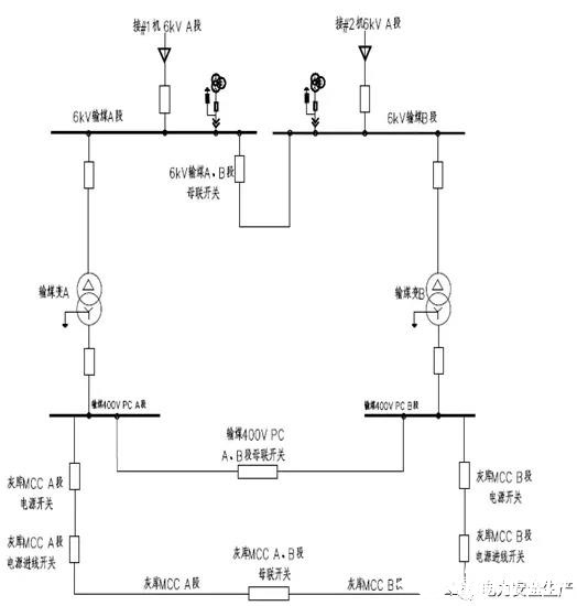 輸煤系統(tǒng)6kV電源設計A、B兩段母線,單母線分段運行,母聯(lián)開關熱備用。輸煤配電室內(nèi)布置兩臺400V輸煤廠用變壓器,高壓側(cè)分別接6kV電源母線A段、B段,低壓側(cè)接輸煤400V母線A段、B段,兩段分段運行,母聯(lián)開關熱備用。