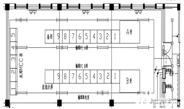 在輸煤配電室內(nèi),同時設計布置灰?guī)霢、B兩段MCC。兩段MCC各帶一個浪涌保護器,分別設置在兩段MCC進線開關側(cè)。400V灰?guī)霱CC開關柜為MNS型開關柜。灰?guī)斓裙孟到y(tǒng)的建設為A標段的工作內(nèi)容,天津公司負責灰?guī)霱CC安裝,天津公司分包給中某建設實施。輸煤系統(tǒng)和灰?guī)祀娫唇泳€圖見圖一;配電室俯視示意圖見圖二。