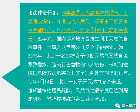 5、若燃氣爆炸事故系人為故意造成,行為人可能會涉嫌刑事犯罪,罪名包括但不限于爆炸罪、以危險方法危害公共安全罪等。