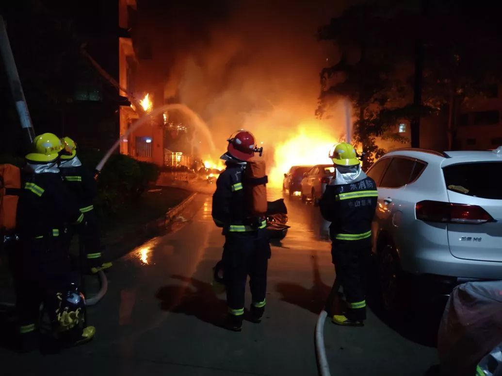 2時34分,中隊剛到場,指揮員立即勘查現場,小車已被大火吞噬,火災已蔓延到附近的出租屋,有人員被困,聽到有六七聲爆炸聲,并看到有氣瓶飛到河對面。