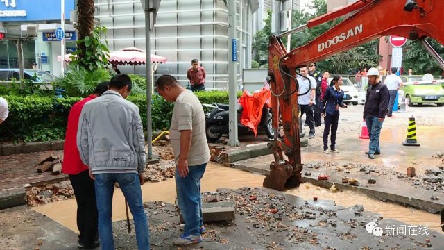 今天下午 2 點 13 分,南寧市金源 CBD 現代城也就是我現在所處的這個位置,發生了一起因施工而造成的管道燃氣泄漏事件,我們從目擊者提供的視頻可以看到,當時泄漏的瞬間是塵土飛揚,痕跡還是十分明顯的,那么通過半個多小時的處置,現在管道的閥門已經被關上了,也通過降低空氣中天然氣的濃度等措施,現在這個位置相鄰的街道已經恢復了行人的通行,但是現場的情況還在變化當中。