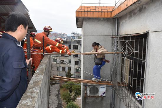 中隊指揮員仔細勘察現場周圍情況后,發現被困的一家人的樓層與相鄰的樓層只隔了1、2米的距離,于是決定從對面樓層將被困人員營救出來。消防官兵找來單杠梯和木板搭在被困人家的窗口,然后再將備好的腰帶扔到對面,讓他們系好,腰帶則用繩索在另外一邊固定。為了讓他們穩住重心,防止摔倒,消防官兵又找來另外一條木棍架在窗與圍墻之間,讓他們可以扶著過來。消防官兵一邊穩住被困人員的情緒,一邊謹慎得操作著,將被困人員身上的保險緊緊拴牢,防止意外事故的發生。待被困人員快到圍墻邊,消防官兵則立即用手拉住他們,抱了上來。在經過讓人窒息的20多分鐘后,一家5口終于有驚無險的被救了出來。