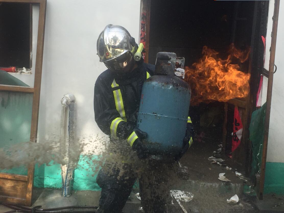 消防官兵到場后,戰士武傳祥在水槍的掩護下,穿戴防護裝備,沖進廚房,將起火的煤氣罐搬到室外空曠區域,并成功處置。