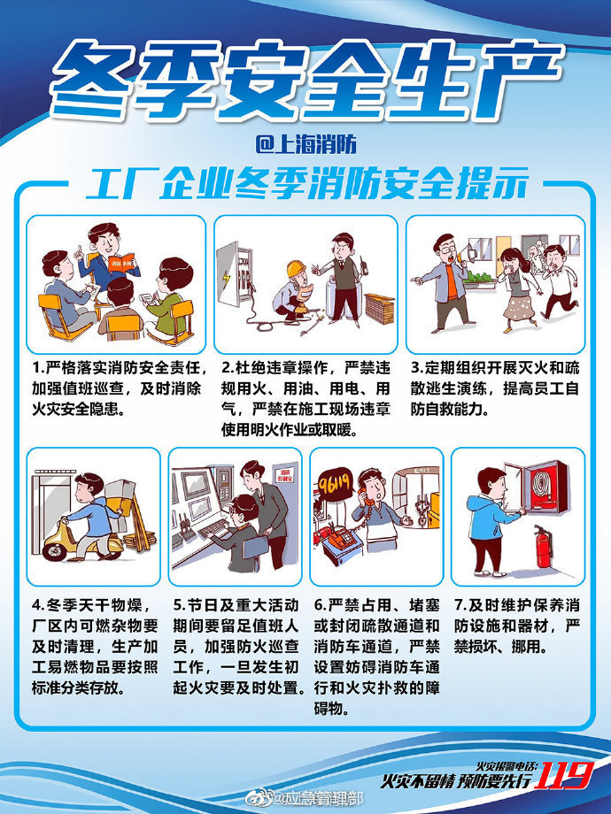 進入冬季,工廠企業安全生產至關重要,各個生產單位切記做好檢查工作,防患于未然。加強值班巡查、嚴禁在施工現場違章使用明火作業或取暖、定期組織開展滅火和疏散逃生演練