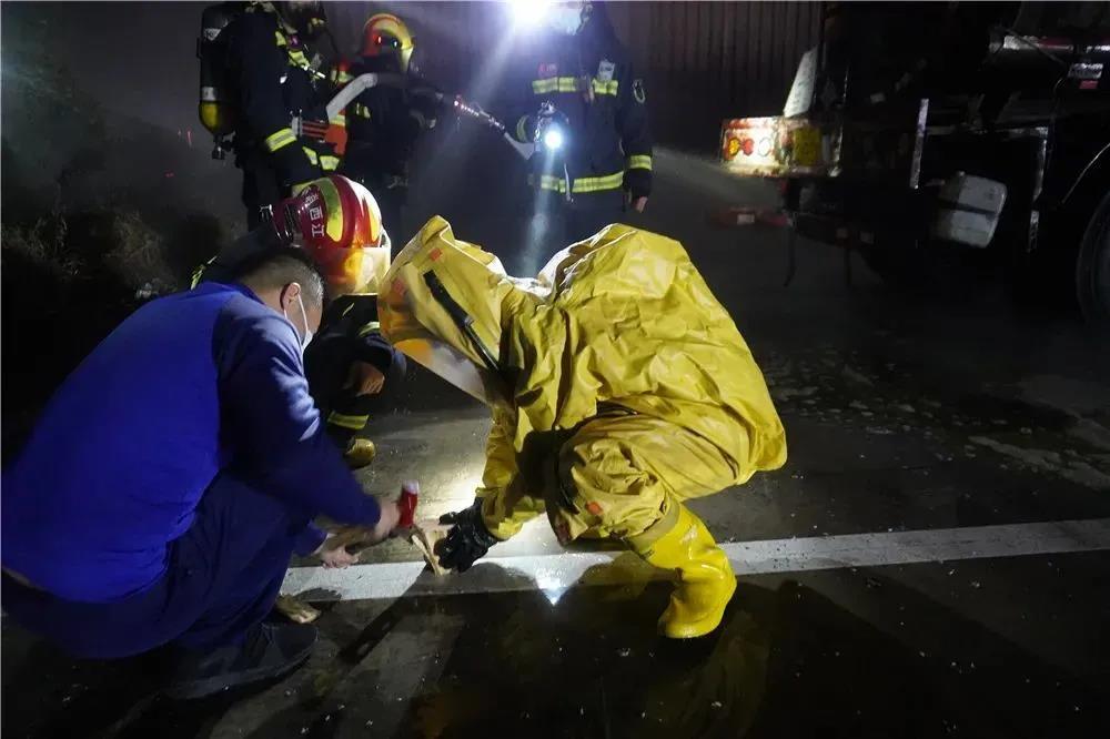隨后,消防救援人員設(shè)置水槍陣地對空氣中的鹽酸進(jìn)行稀釋處置,并協(xié)調(diào)相關(guān)聯(lián)動單位調(diào)來石灰和沙土對泄露鹽酸進(jìn)行堵截。經(jīng)過5個小時的持續(xù)處置,現(xiàn)場環(huán)境監(jiān)測部門監(jiān)測確認(rèn)無危害后,消防救援人員移交現(xiàn)場。